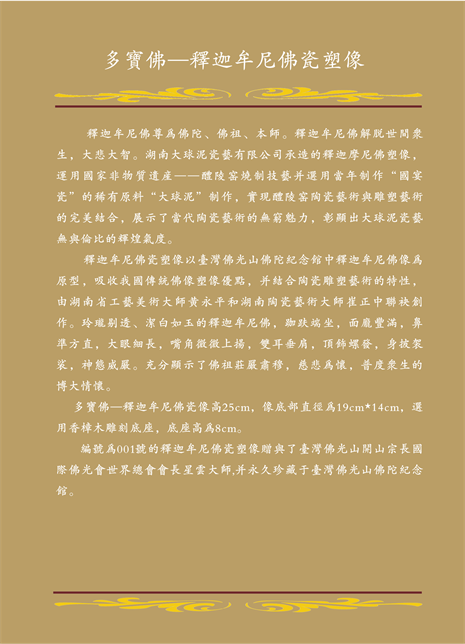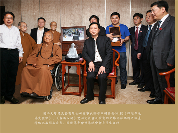 釋迦牟尼佛瓷塑像以臺灣佛光山佛陀紀念館中釋迦牟尼佛像為原型,吸收我國傳統(tǒng)佛像塑像優(yōu)點,并結(jié)合陶瓷雕塑藝術(shù)的特性,由湖南省工藝美術(shù)大師黃永平和湖南陶瓷藝術(shù)大師崔正中聯(lián)袂創(chuàng)作。玲瓏剔透、潔白如玉的釋迦牟尼佛,跏趺端坐,面龐豐滿,鼻準方直,大眼細長,嘴角微微上揚,雙耳垂肩,頂飾螺發(fā),身披袈裟,神態(tài)威嚴。充分顯示了佛祖莊嚴肅穆,慈悲為懷,普度眾生的博大情懷。該尊釋迦牟尼佛瓷雕種模像由臺灣星云大師開光并題寫《多寶佛》贈予湖南大球泥瓷藝有限公司。釋迦牟尼佛瓷像高26cm,底座選用香樟木雕刻為蓮花座。星云大師為釋迦牟尼佛瓷塑像題寫的墨寶《多寶佛》2014年5月30日董事長滕召華向臺灣佛光山開山宗長星云大師捐贈編號為001號的《釋迦牟尼佛瓷塑像》和李自健先生原創(chuàng)的《春滿人間》雙面瓷板畫及珍貴的大球泥原料