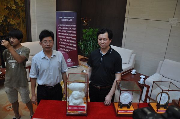 8月1日,湖南大球泥瓷藝有限公司董事長(zhǎng)滕召華(右)向韶山毛澤東同志紀(jì)念館捐贈(zèng)大球泥原料樣品