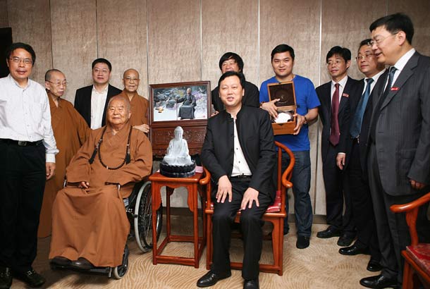 2014年11月10日上午許,在旅美畫家李自健先生的長沙創作室,大球泥瓷藝董事長滕召華親自請了一尊潔白如玉的《多寶佛》(釋迦牟尼佛瓷塑像)給李自健先生,并向大家介紹說,“今年初,我最開始有用珍稀原料大球泥塑造佛像題材的想法時,得到了李老師的支持。在創作‘釋迦牟尼佛瓷塑像’的過程中,李老師更是給了很多寶貴的意見,他希望我們能塑造出有世界聲望的佛雕作品。在李老師的引薦下,今年5月30日,我又有幸與臺灣佛光山開山宗長星云大師結緣,并將001號‘釋迦牟尼佛瓷塑像’捐贈給星云大師永久收藏于佛光山。”
