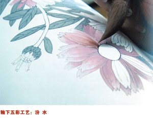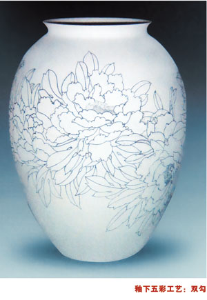 裝飾紋樣結構嚴謹,造型簡練。不輕佻、不淺薄,不矯揉造作,給人莊重、大氣的美感,藝術上十分耐人尋味,使人親近。醴陵釉下五彩瓷這一獨到風格的形成,與它特有的那種雙勾汾水彩飾技法有著密切的聯系。“雙勾汾水”是醴陵釉下五彩的精髓,也是醴陵釉下五彩的秘笈。彩繪中先用線條勾勒圖形輪廓,再以汾水法填以色彩。勾線表現出高超的技巧,使之富有濃厚的裝飾特征。所勾出來的墨線和色線十分奇特,色線根據預設的顏色燒成后呈現鮮艷的色調,墨線則在一定溫度下消失,呈現空白線條。汾水則不僅要求色彩平坦,并且要呈現出多種層次,因而要運用罩色與接色等多種技法。