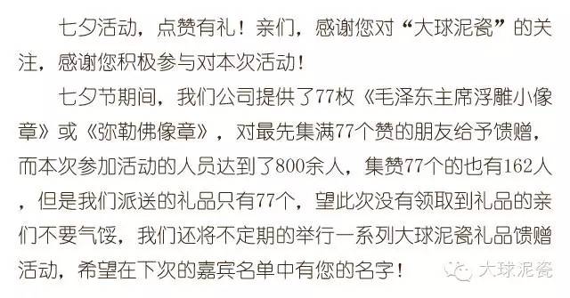 我們郵寄天使在近三天會把77枚《毛主席浮雕小像章》或《彌勒佛像章》請到您府上。感謝您傳遞“大球泥瓷”的美好祝愿,愿所有人天天“七夕”,愿天下有情人終成眷屬!
