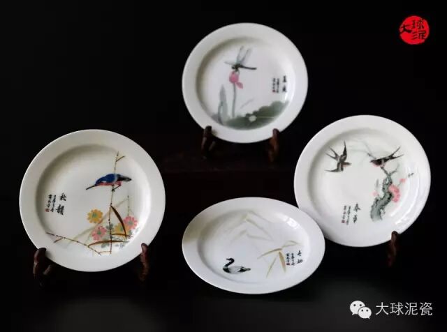 《四季》掛盤,以大球泥為原材料,由工藝美術大師黃永平創作。這四款藝術作品以春華、夏爽、秋韻、冬趣組成的《四季》掛盤,經高溫燒制而成,瓷質細膩,潔白無瑕,散發出高貴典雅的氣質。它又與釉下五彩工藝的完美結合,使得畫面栩栩如生,更是增添魅力。細細觀賞,《四季》掛盤濃而不俗,淡而有神,顯得晶瑩透亮具有飽滿的水份感。這樣一組精美的大球泥瓷藝術品,具有收藏價值。