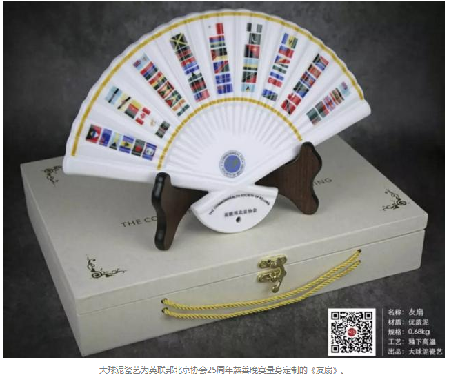 三個月前,大球泥瓷藝受邀為這次晚宴承制一套富有中國特色的禮品。經過反復研討、設計,最終選擇以中國折扇為造型,正面配以53個英聯邦成員國的國旗,背面選擇中國長城畫面,作品取名《友扇》,扇同善,寓意各國之間友好相處。