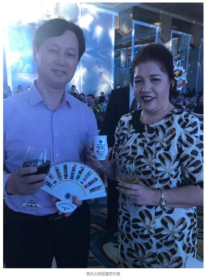 大球泥瓷藝董事長滕召華表示:“此次的《友扇》、《牽手杯》作品能受到那么多外國大使及夫人們的青睞,一是說明我們的設計理念符合當下的構建人類命運共同體大趨勢;二是說明我們的產品造型制作十分優良;三是說明國外友人都非常熱愛發展的中國、喜歡中國的瓷器”。