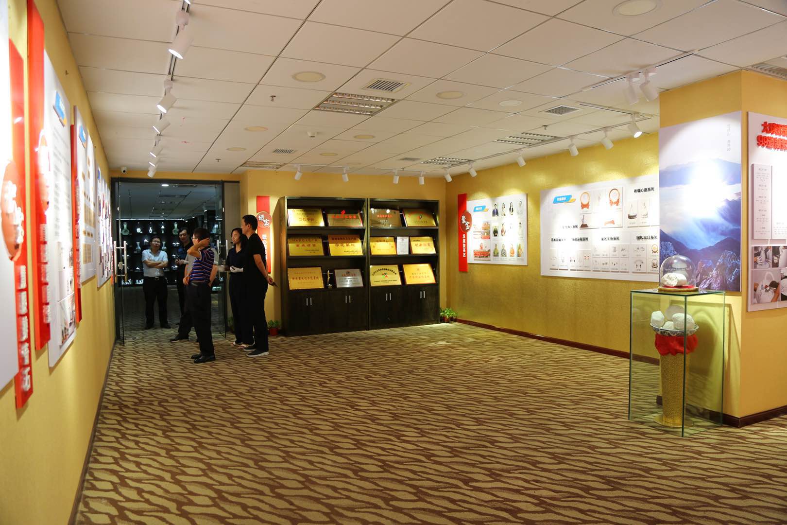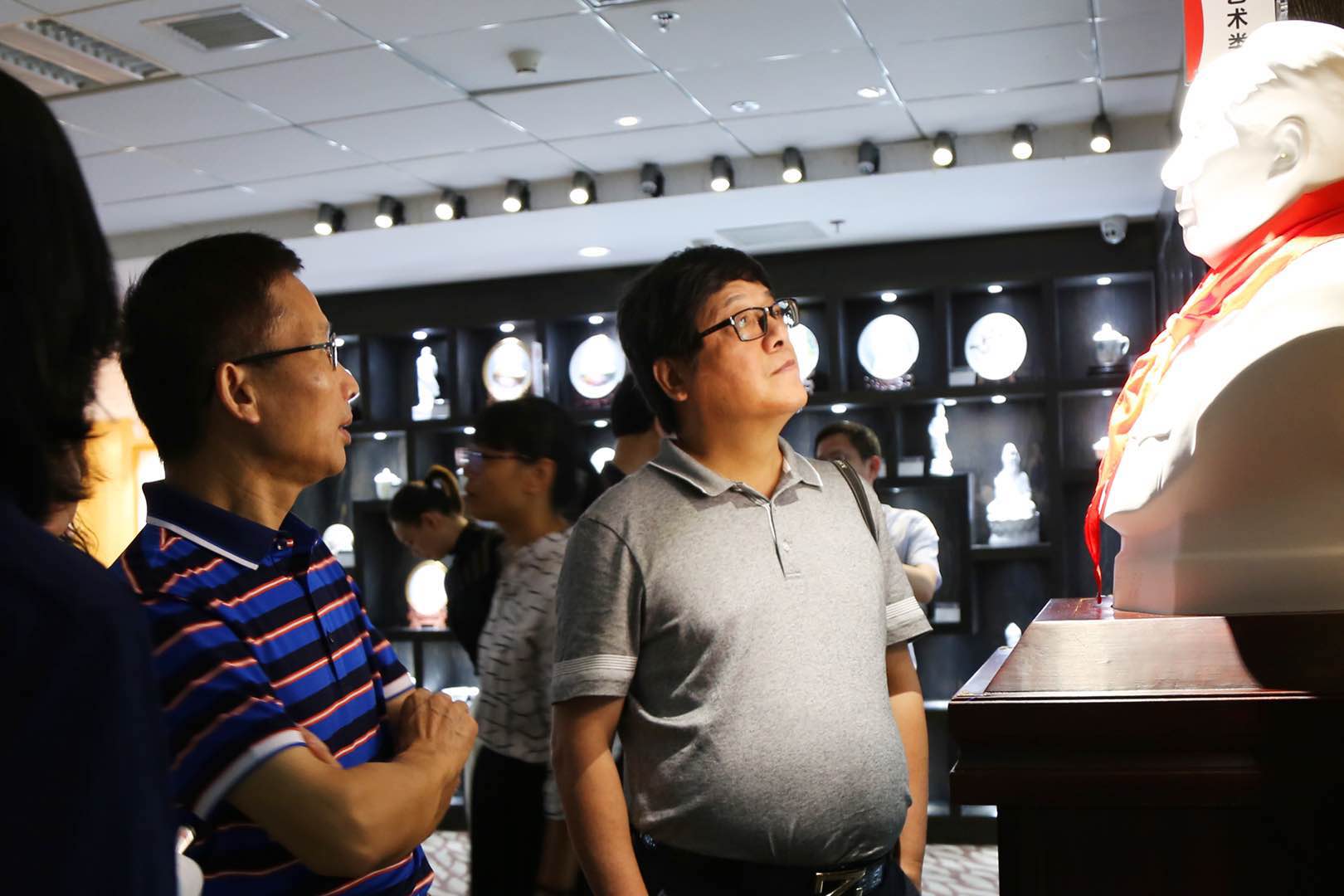 隨后考察團移步到大球泥產品展示廳,參觀了紅色偉人系列、祈福平安系列、藝術收藏系列、生活定制系列、景區文創系列、外交國禮系列等產品(作品)。當講解員把大球泥和優質泥同一器型的杯子放到燈光下后,考察團一行都驚訝了,一個潔白、溫潤、通透,一個泛黃、暗淡、渾暈,異口同聲感慨到大自然的鬼斧神工,大球泥瓷實屬不可多得的瓷中精品?疾靾F何團長還挑選了一把壺上手,細細撫摸,慢慢回味,說大球泥瓷的感覺就是有說不出的爽!