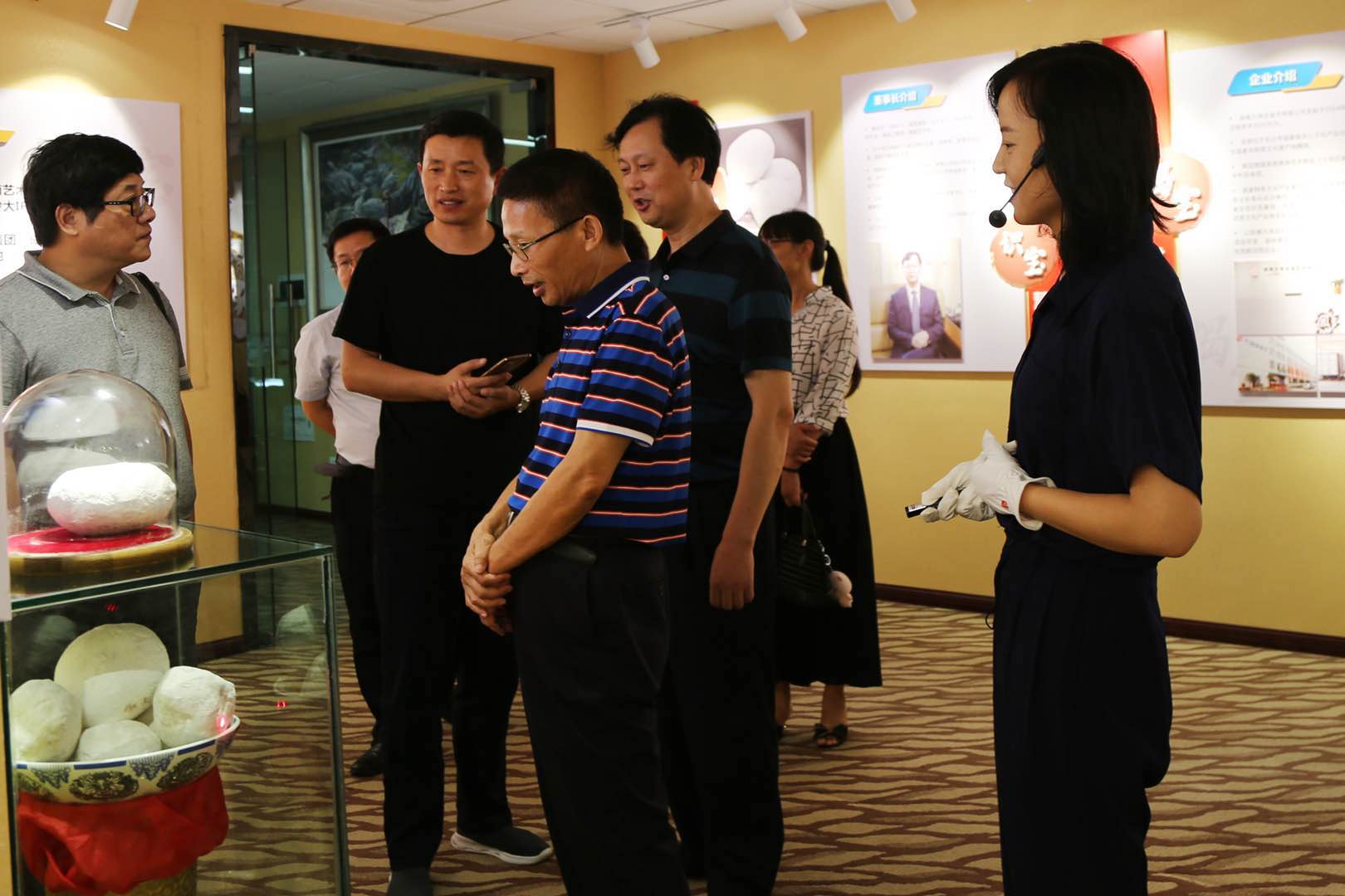在滕召華董事長的陪同下,考察團一行首先參觀了大球泥瓷藝的企業文化展廳,營銷總監徐亞美做了全程講解。大家認真聽取了公司簡介與發展歷程、原料保護與系統研發、生產設計與市場定位、團隊建設與發展愿景等情況的詳細介紹。專家們都是來自瓷都江西,對高嶺土可以說見怪不怪,但看到大球泥后,卻是大開眼界,十分好奇,不斷探詢形成原因、所有儲量、品質結構等。
