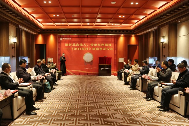 12 月 26 日上午,緬懷革命偉人、傳承紅色精神暨《旭日東升》捐贈儀式在韶山舉行。省人大原副主任肖雅瑜、省軍區原副政委黃祖示、省工商聯秘書長祝擁軍、長沙市委宣傳部副部長郭潤葵、韶山市委常委宣傳部長李先金、一級戰斗英雄羅振明等出席了捐贈活動。
