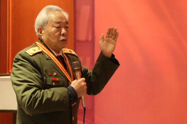 黃祖示將軍是兩彈一星的功勛,在部隊期間,年年被評為五好戰士,并被毛澤東主席親自接見。他感慨道,開國元勛們是人民的大救星,沒有老一輩的浴血奮斗就沒有新中國。動情之處,黃祖示將軍起身高歌——“東方紅,太陽升……”現場人員隨聲合唱,掌聲雷動。
