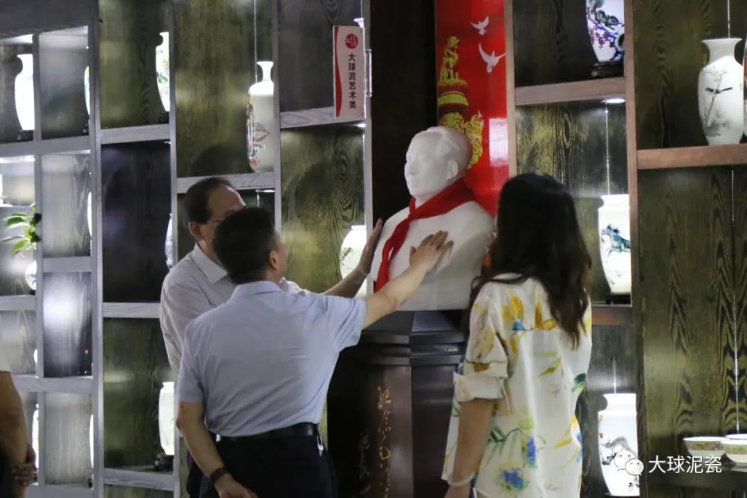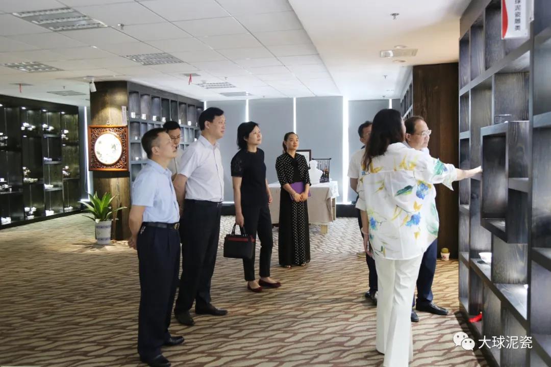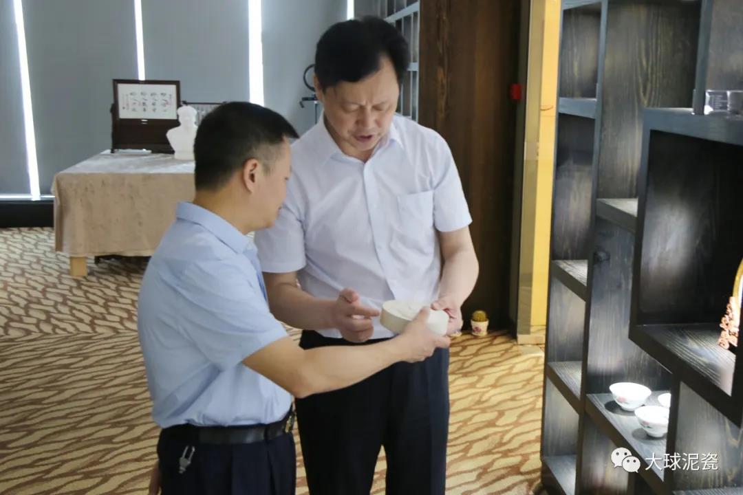 賀廳長一行首先參觀了公司的精品展廳,常務副總張萍作了專業講解。賀廳對映入眼簾的大球泥原料產生了興趣:“這個雪白球狀的原料是經過加工提煉的?”滕總回答:“從地下挖出來就是這個樣子。大球泥是偉晶巖風化物,全部為橢圓球狀,一般在20cm大小, 雜質都集中于球體中心形成一個內核,是世上極為稀有的非金屬礦石。”在看到琳瑯滿目的高端藝術陶瓷時,他被深深吸引了,拿著大球泥作品和普通泥作品在燈光下進行比較,發現一個白、潤、透,一個黃、渾、淡,問兩個作品的厚度是否一樣,滕董答兩個作品的厚度、畫面完全一樣,但品質效果明顯不同。郭局長則打開手機燈光對大球泥的杯子和優質泥杯子反復照探,比較差異。其他領導也是提問不斷,工藝技術、產品質量、創作風格、市場細分等等。