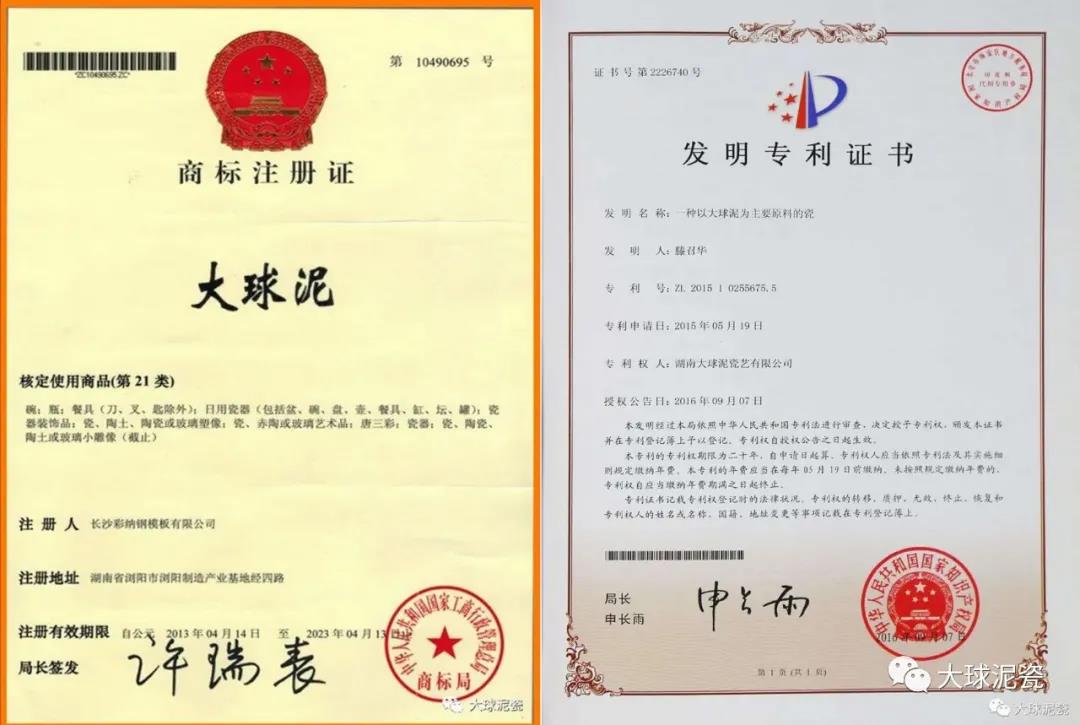 二、“大球泥”是注冊商標(biāo)。在國家工商管理總局申請資料上查詢到,2012年1月之前長沙彩納鋼模板有限公司就申請注冊“大球泥”這個商標(biāo),2013年4月14日國家工商管理總局頒發(fā)注冊商標(biāo)證書。媒體報道,滕召華通過十余年的不懈努力,前后投入近億元,對大球泥原料及工藝配方進(jìn)行搶救性保護(hù);組織中國工程院院士、陶瓷專家、材料專家對大球泥進(jìn)行深度研究;組織科研人員及工匠,經(jīng)過上百次的配方試驗,終于獲得了理想的大球泥煉制配方;突破了高溫釉下五彩藝術(shù)瓷的技術(shù)難題,結(jié)合景德鎮(zhèn)青花、德化白瓷雕塑、宜興紫砂壺、臺灣琺瑯彩等工藝技術(shù),發(fā)明了大球泥的獨創(chuàng)燒制方法。湖南大球泥瓷藝有限公司 自2013年注冊了“大球泥”商標(biāo)之后,又注冊了“大球泥瓷” 、“大泥球”、 “球泥”、“球泥瓷坊”、“白鳳凰”等一系列商標(biāo)。