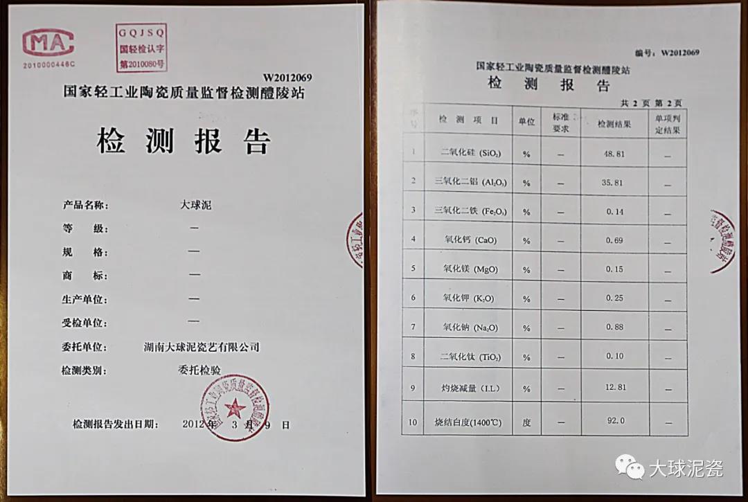 “大球泥”一詞最早出現(xiàn)在公眾是2012年1月,2012年3月9日國家輕工業(yè)陶瓷質(zhì)量檢測醴陵站的檢測報告,2012年10月22日百度百科的引用詞條,除此之外,沒有更早的媒體報道有關(guān)“大球泥”了。縱觀所有資料來看,“大球泥”有三個注解。