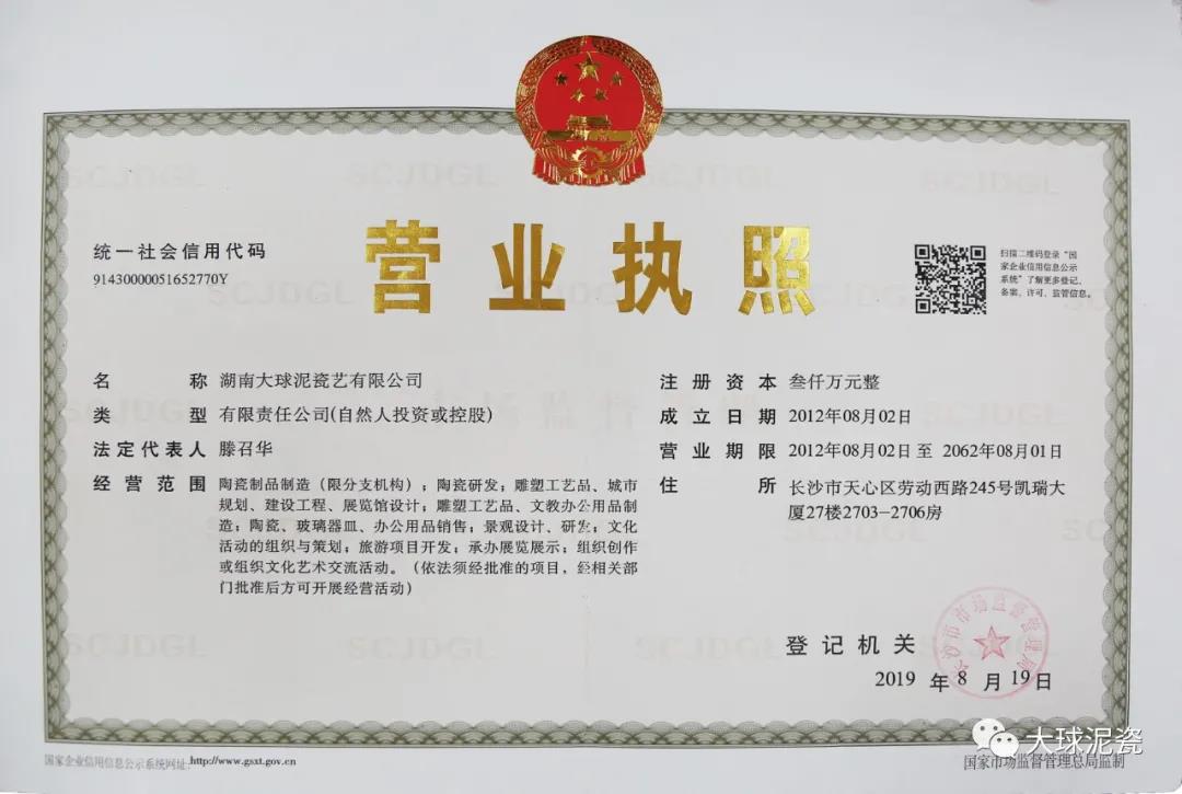 三、“大球泥”是知名企業(yè)。在湖南省工商管理局的企業(yè)注冊登記資料中查詢“大球泥”得知,湖南大球泥瓷藝有限公司于2012年8月2日在湖南省工商管理局注冊成立并領(lǐng)取營業(yè)執(zhí)照,之后又有幾次營業(yè)范圍變更,但是名稱一直沿用至今。在百度上查詢“大球泥”是國家特色文化產(chǎn)業(yè)重點項目、國家高新技術(shù)企業(yè)、湖南省特色文化產(chǎn)業(yè)示范基地、湖南省雙創(chuàng)示范基地等。該公司是我國高端藝術(shù)陶瓷《大球泥瓷》地方標(biāo)準(zhǔn)的制定者,擁有專利近百項,“大球泥”也是湖南著名品牌。營業(yè)范圍為大球泥原料研究,高端藝術(shù)陶瓷定制,文旅項目開發(fā),城市品牌策劃,公共文化藝術(shù)工程等領(lǐng)域。