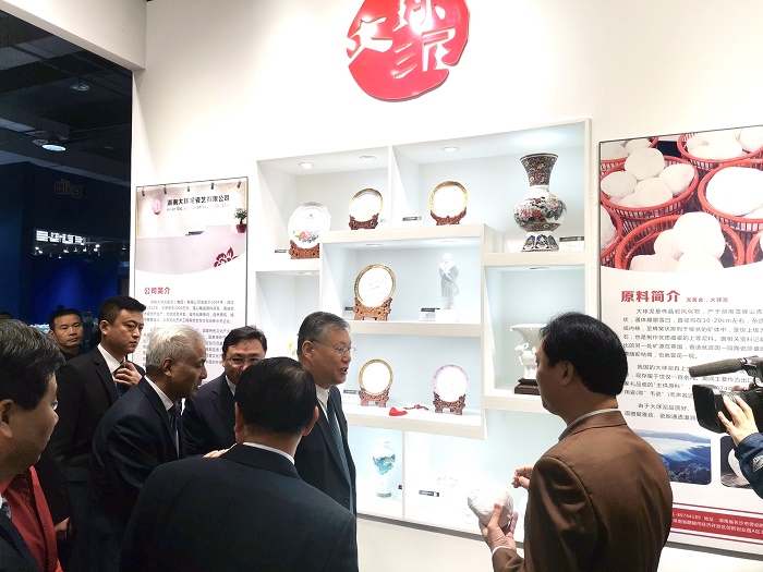 全國政協副主席劉新成、江西省長易煉紅等領導重點巡視了大球泥瓷藝展館。在《為人民服務》瓷塑像前,領導們駐足凝視、無限崇敬。滕董事長介紹了這尊毛澤東主席半身雕塑的原創作者、原料配方、制作工藝、高溫承制的艱難過程,重點講解了“毛瓷”的核心原料——大球泥的稀缺性、珍貴性。易省長鼓勵大球泥做精做美,在景德鎮發揚光大。