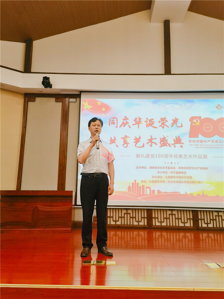 6月10日,同慶華誕榮光•共享藝術(shù)盛典--獻(xiàn)禮建黨100周年經(jīng)典藝術(shù)作品展在長(zhǎng)沙開(kāi)幕。省人大原常委會(huì)副主任、省文化藝術(shù)基金會(huì)主席肖雅瑜,省文旅廳產(chǎn)業(yè)處二級(jí)調(diào)研員陳岳安,省工商聯(lián)商會(huì)處處長(zhǎng)張帆,省工商聯(lián)商協(xié)會(huì)黨委二級(jí)調(diào)研員湛建階,省民營(yíng)文化產(chǎn)業(yè)商會(huì)會(huì)長(zhǎng)滕召華、支部書(shū)記梁雙、常務(wù)副會(huì)長(zhǎng)曾偉清等百余人參加開(kāi)幕式。