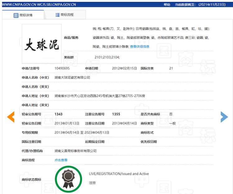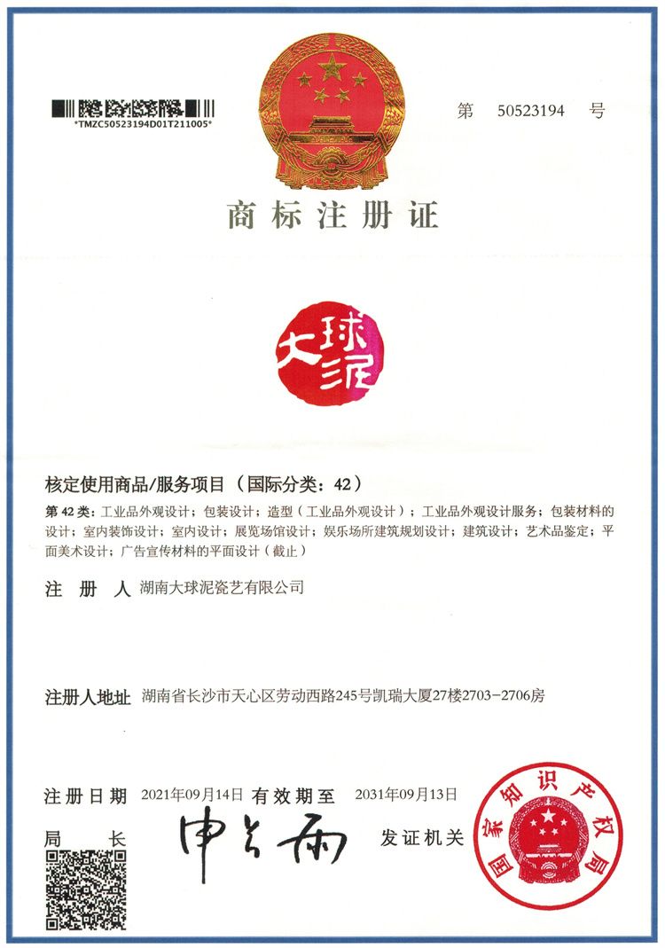 近期,我公司收到國家知識產權局頒發的“大球泥”在國際分類42類商標注冊證書,這一注冊商標的啟用,標志著“大球泥”商標不僅在陶瓷器具、廣告宣傳等領域受到保護,而且在建筑施工、工業設計等領域也受到保護。