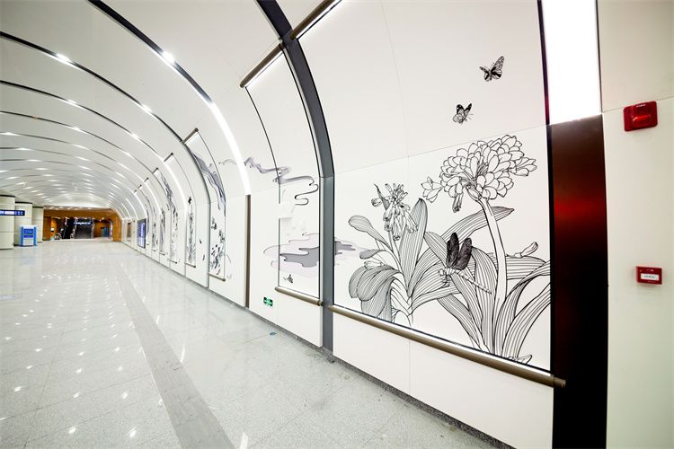 十里河站通過營造國畫的意境,采用現(xiàn)代工藝方式,體現(xiàn)十里河傳統(tǒng)的古玩文化及現(xiàn)代轉(zhuǎn)型升級。將地鐵空間與周邊文化特色結(jié)合,用瓷器、白描、剪紙、掐絲等組合方式,創(chuàng)作出了《十里河·國畫意境》、《十里河·古趣風(fēng)采》《十里河·方寸之間》、《十里河·魚貫而入》四個(gè)篇章,將“十里長河”的“古意古韻”娓娓道來。