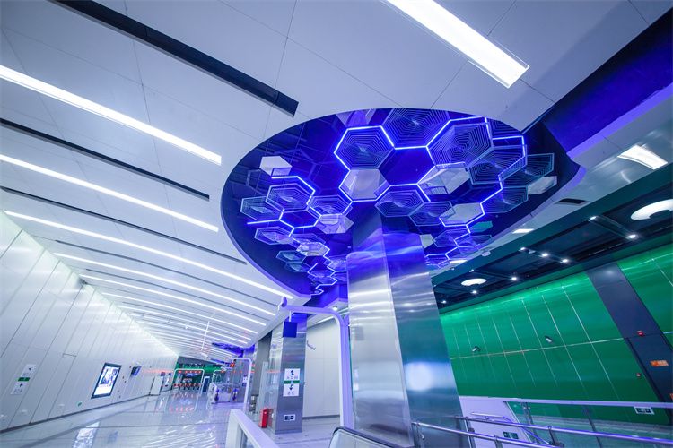 北神樹站則圍繞“智慧之樹”的主題進(jìn)行延伸,將北神“樹”與“生物醫(yī)藥符號(六邊形)”進(jìn)行藝術(shù)化組合,用流動藝術(shù)燈光和六邊形交織穿插,有序無形相結(jié)合,寓意生物科技有序發(fā)展,展現(xiàn)生物科技神秘力量。通過移動年輪、生物指紋、流動漣漪等形式,描述生命演變、生生不息。讓乘客觸摸現(xiàn)代科技感,體驗(yàn)生命流動感,回味人生變化感。