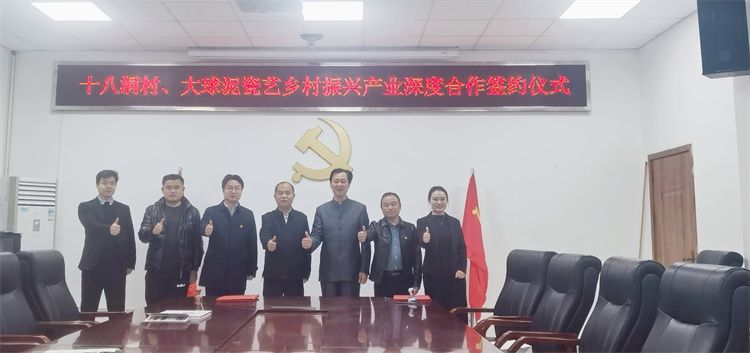 3月17日上午,大球泥瓷藝與十八洞村就鄉村振興產業深度合作在花垣縣十八洞村部簽約。 第二十屆中央候補委員、花垣縣雙龍鎮副鎮長、十八洞村黨支部書記施金通,十八洞村駐村第一書記、鄉村振興工作隊隊長田曉,十八洞村經濟合作社理事長龍書優,公司董事長滕召華、副總經理姚衛、銷售經理吳大樑等出席簽約儀式。